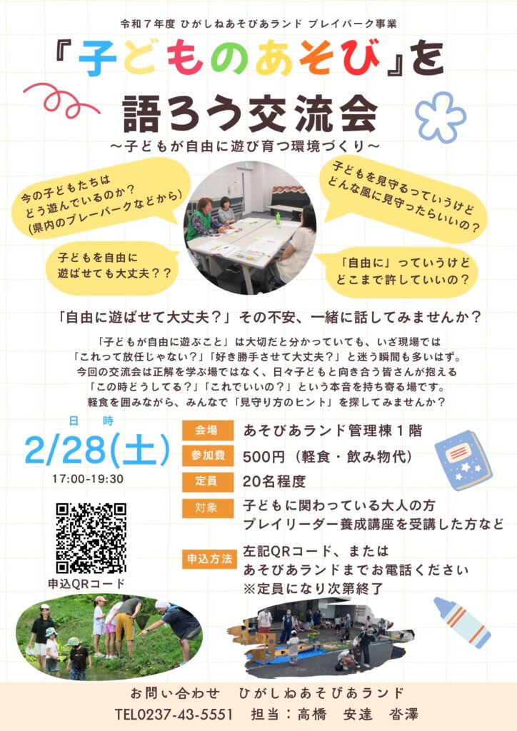 申込方法:チラシのQRコードからお申し込みまたはあそびあランド(0237-43-5551)へお電話ください。